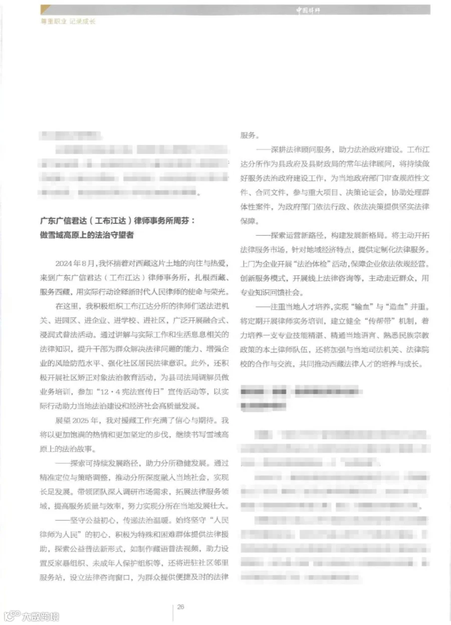 近日,广信君达(工布江达)律师事务所负责人周芬律师撰写的文章《做雪域高原上的法治守望者》,刊发于《中国律师》杂志2025年第1期。