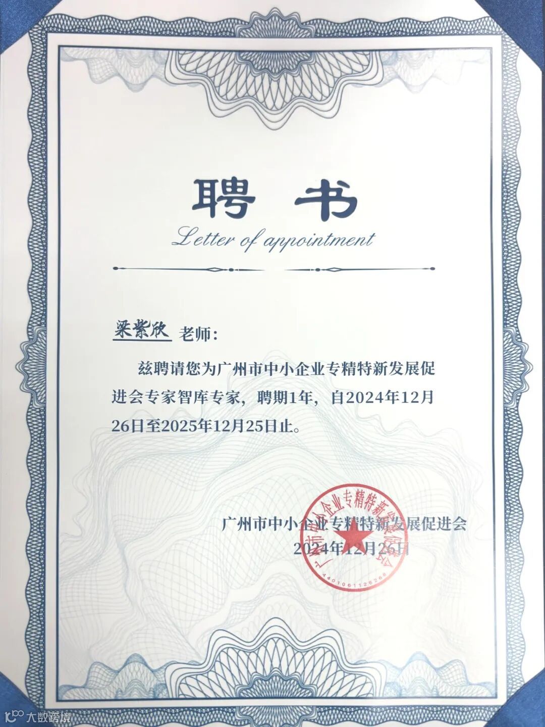 近日,广信君达律师事务所梁紫欣、罗颖彤律师获聘为广州市中小企业专精特新发展促进会(下称“市企业发展促进会”)专家智库专家,聘期一年。