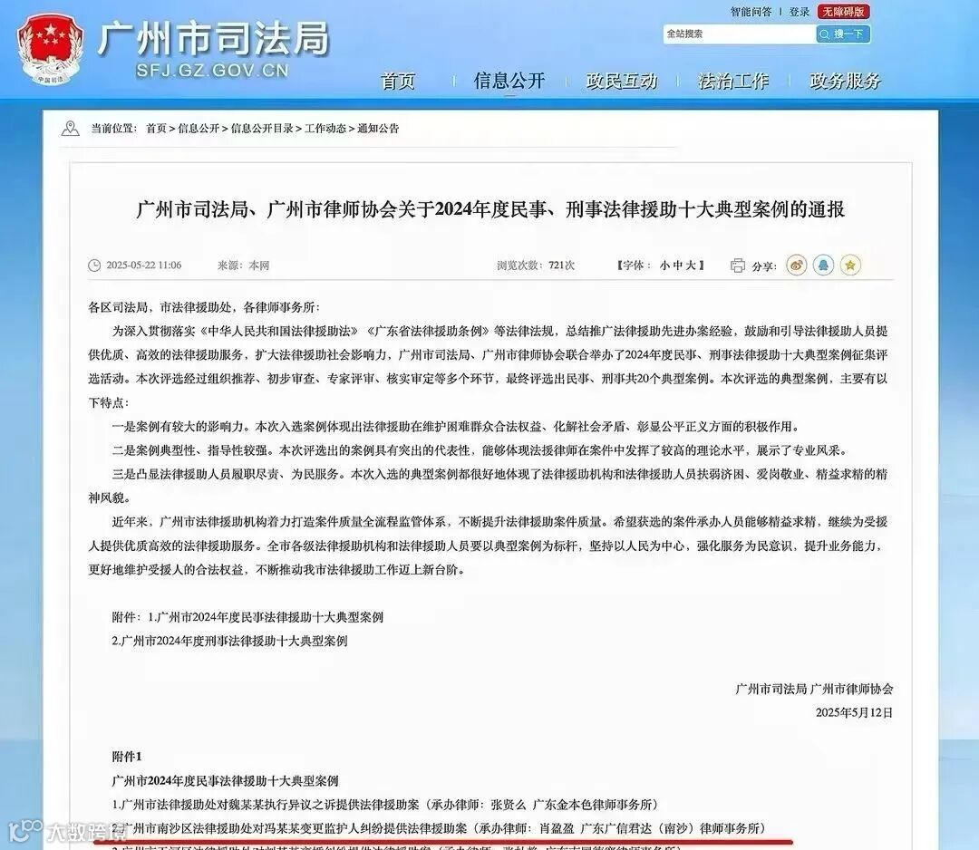 广信君达南沙分所肖盈盈律师经办的《广州市南沙区法律援助处对冯某某变更监护人纠纷提供法律援助案》成功入选2024年度民事法律援助十大典型案例。