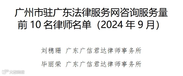 本所合伙人刘穗珊律师在2024年9月驻网咨询服务量位居全市第一名、专职律师毕丽荣居全市第七名,获广州市司法局、广州市律师协会通报表扬;陈华宇律师承办的案件在广州市法律援助处公布的市本级2024年度第三季度法律援助案件质量同行评估情况获评为优秀等次案件。