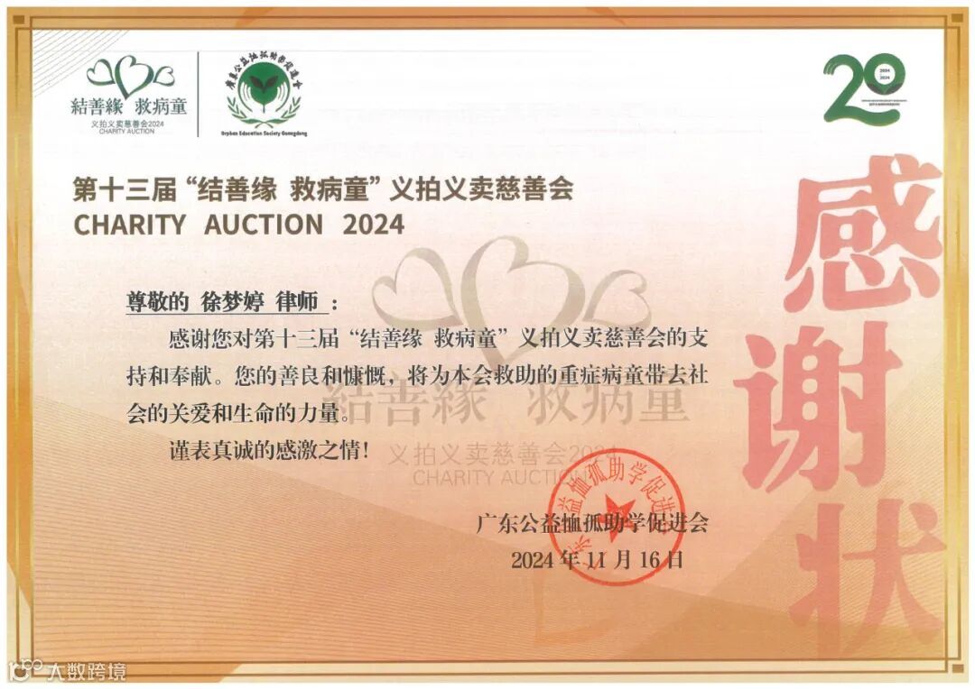 本所指派徐梦婷律师代表参加广东公益恤孤助学促进会第十三届“结善缘 救病童”义拍义卖慈善会,为慈善会的筹备和开展提供专业法律咨询服务。
