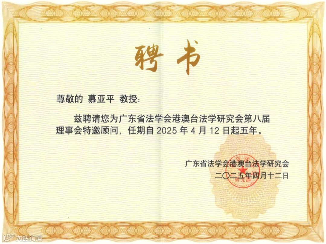 近日,广东省法学会港澳台法学研究会(下称“港澳台法学研究会”)第八次会员代表大会暨学术年会成功举办。会议经过严格的资格审查和投票程序,选举产生了港澳台法学研究会第八届理事会,广信君达律师事务所高级合伙人慕亚平律师获聘为港澳台法学研究会第八届理事会特邀顾问,本所合伙人周莲律师及郭伟律师担任第八届理事会理事。