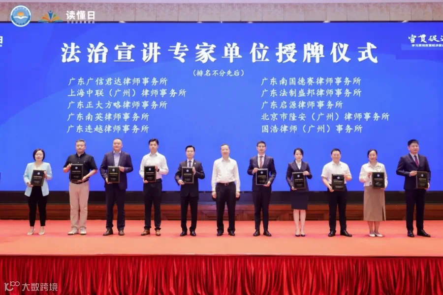 会上,广信君达等10家机构所获颁“法治宣讲专家单位”牌匾。本所将积极宣传贯彻民营经济促进法,促进企业学法用法,助推政企良性互动,引导民营企业融入广州“12218”现代化产业体系建设。