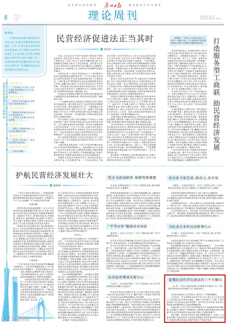 日前,《广州日报》A8版《理论周刊》邀请专家及民营企业家代表,解读民营经济促进法。闪涛律师就立法赋权、执法约束、司法保障三个关键词,解读民营经济促进法出台为广大民营企业带来的利好。