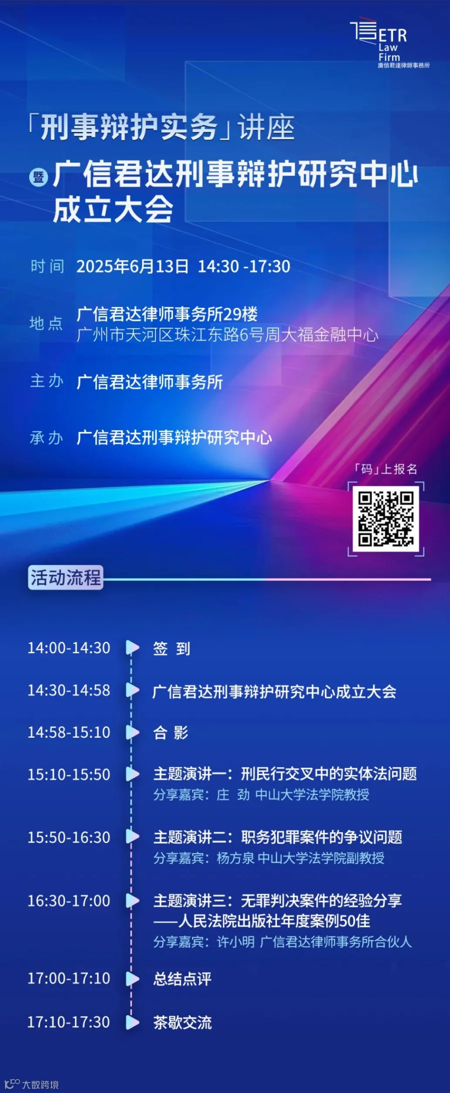 为持续提升广信君达刑事业务的核心竞争力,强化专业研究与实务交流,本所定于2025年6月13日举办刑事辩护实务讲座暨广信君达刑事辩护研究中心成立大会。