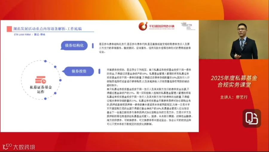 为更好地协助各私募机构开展合规自查活动,分享最新监管形势和资讯,进一步增强各私募机构的合规管理能力,近日,广州私募基金协会、佛山市千灯湖创投特色小镇分别与广信君达律师事务所开展“2025年私募机构规范发展活动”合规分享会。本所投融资法律专业部秘书长廖艺行律师受邀担任主讲人,活动通过线上线下的方式举行,累计超300人次参加交流。
