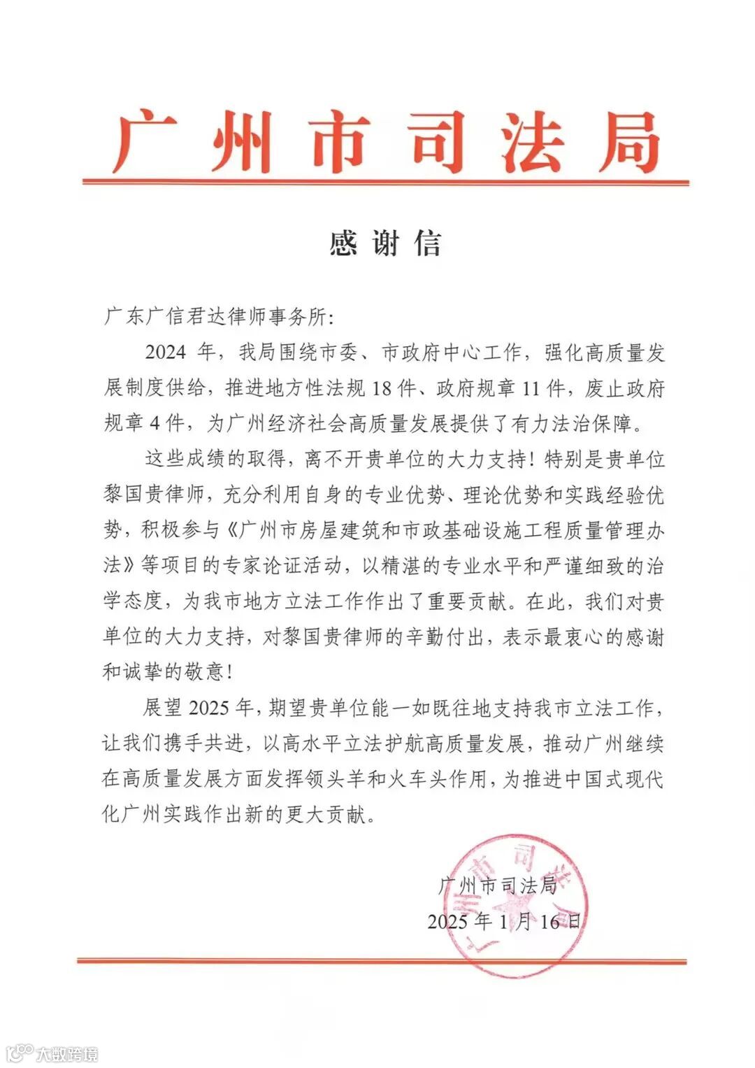 本所收到广州市司法局发来的感谢信。广州市司法局对2024年度本所在立法工作中给予的大力支持,以及对本所高级合伙人黎国贵律师积极参与《广州市房屋建筑和市政基础设施工程质量管理办法》等项目的专家论证活动表示衷心感谢。