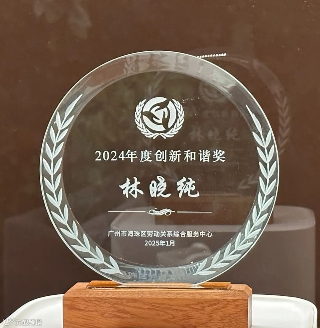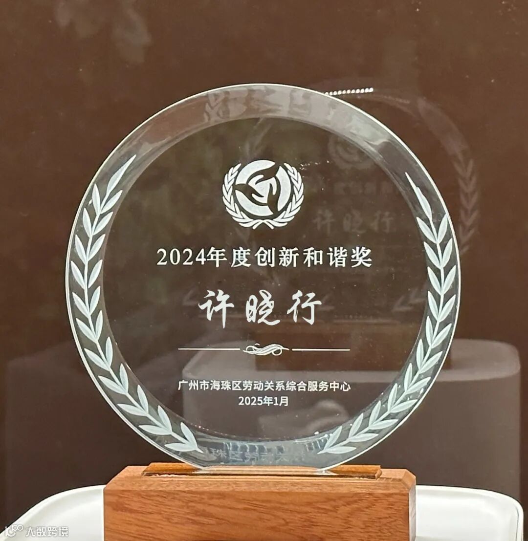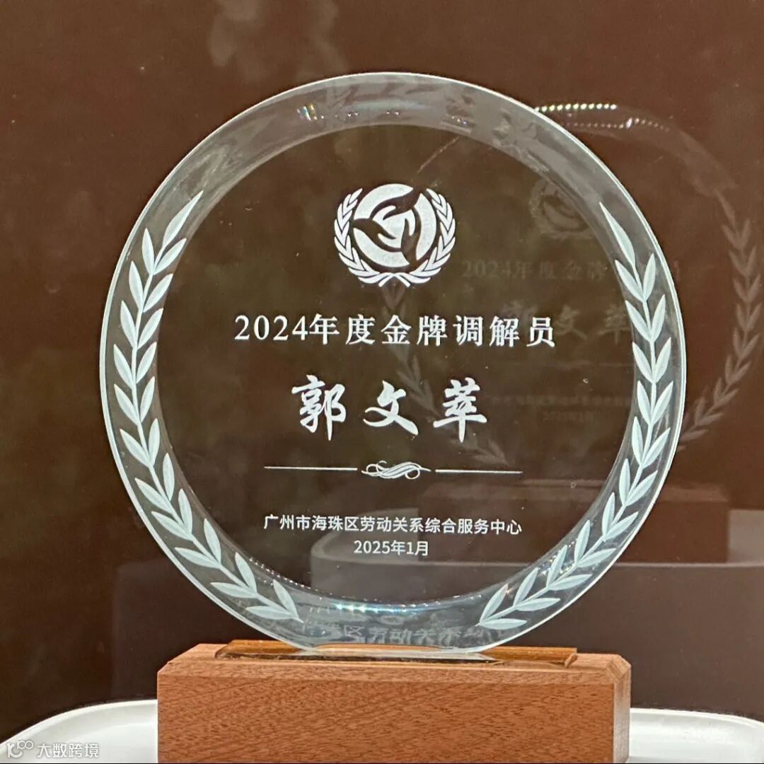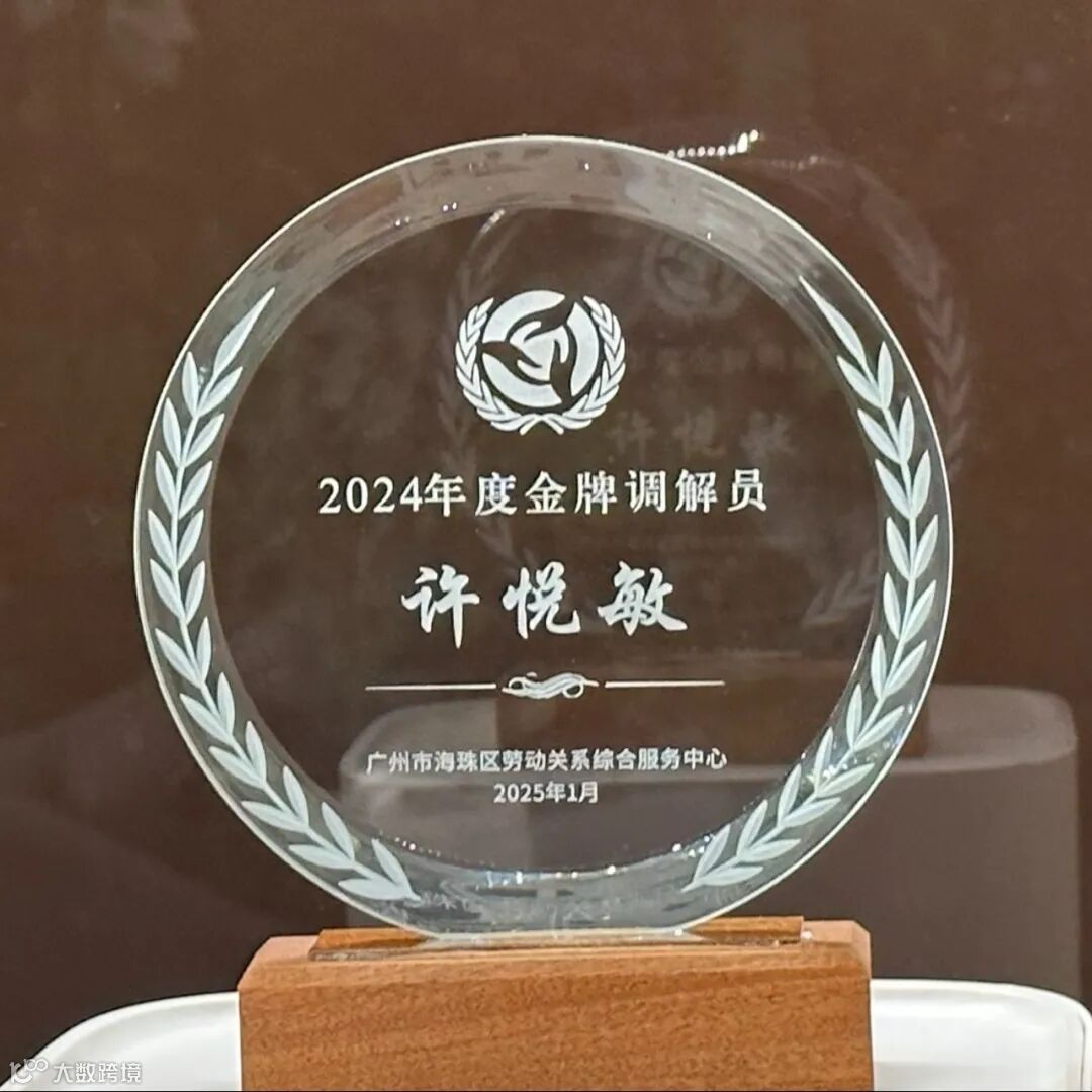 本所合伙人许悦敏、专职律师郭文萃荣获广州市海珠区劳动关系综合服务中心2024年度“金牌调解员”称号;合伙人林晓纯、专职律师许晓行荣获2024年度“创新和谐奖”。