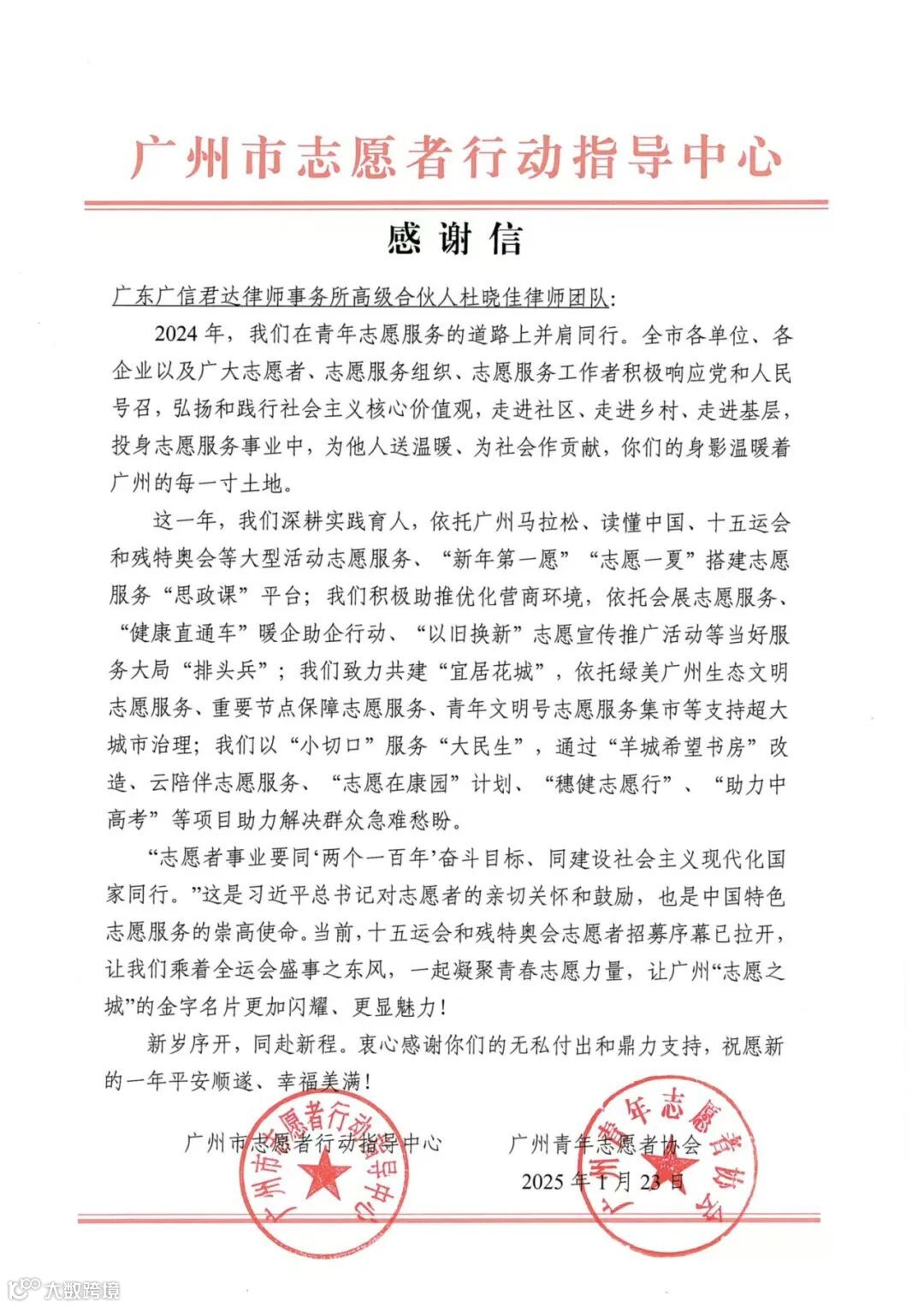 本所杜晓佳律师团队收到来自广州市志愿者行动指导中心、广州青年志愿者协会联合发出的感谢信。