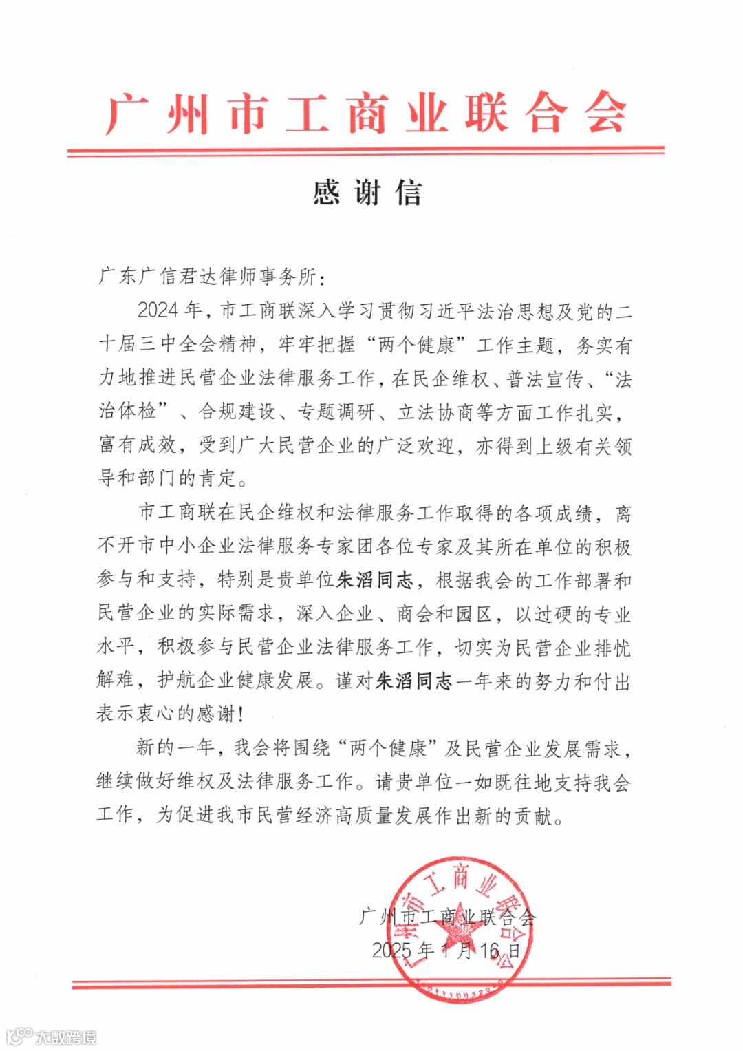 本所收到广州市工商业联合会发来的感谢信。广州市工商联对本所及高级合伙人朱滔律师积极参与民营企业法律服务工作,护航企业健康发展表示赞扬与感谢。
