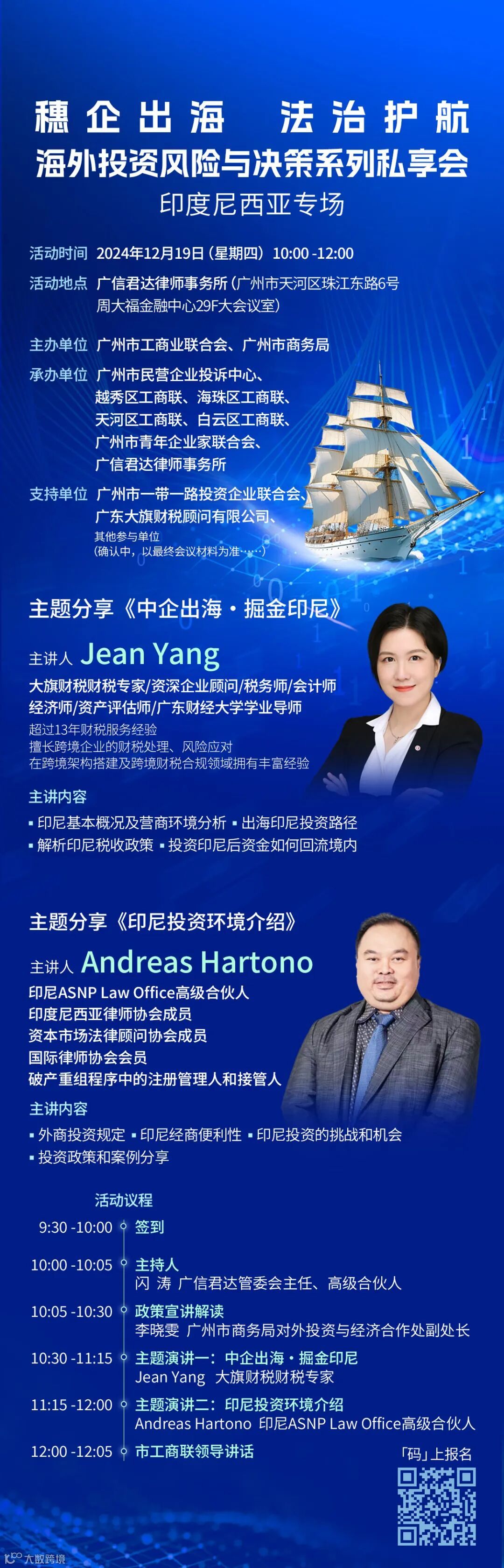 此次活动聚焦粤港澳大湾区企业投资印度尼西亚的关注重点及法律难点,邀请境内外专业律师、财税专家提供专业风险防范策略,助力企业“走出去”,擦亮广州对外开放名片。诚邀广州市工商业联合会、广州市商务局下属各商(协)会及会员企业和有投资印度尼西亚需求的企业报名参加!