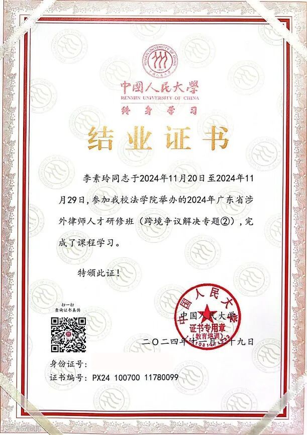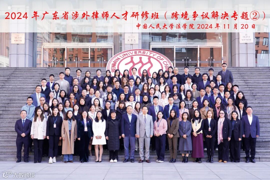 为进一步加强广东省涉外律师人才队伍建设,提升广东省律师在跨境争议解决领域的实务能力,更好地服务广东省企业“走出去”,2024年11月20日至11月29日,由广东省司法厅、广东省律师协会主办,中国人民大学承办的2024年最后一期广东省涉外律师人才研修班(总第28期)——跨境争议解决专题②在北京举办。广东省律师协会副会长田学东,中国人民大学法学院党委书记兼副院长、教授杜焕芳出席开班仪式并致辞。广东省110名律师参加培训,其中,广信君达律师事务所李素玲、郝纲铭律师参加并顺利结业。
