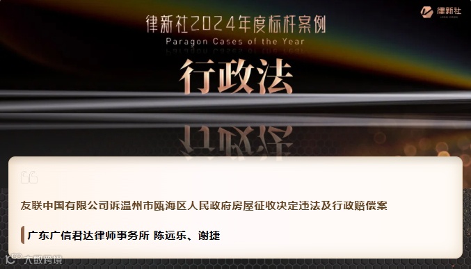 近日,广信君达律师事务所高级合伙人陈远乐律师、合伙人谢捷律师主办的“友联中国有限公司诉温州市瓯海区人民政府房屋征收决定违法及行政赔偿案”,获评“律新社2024年度标杆案例”。