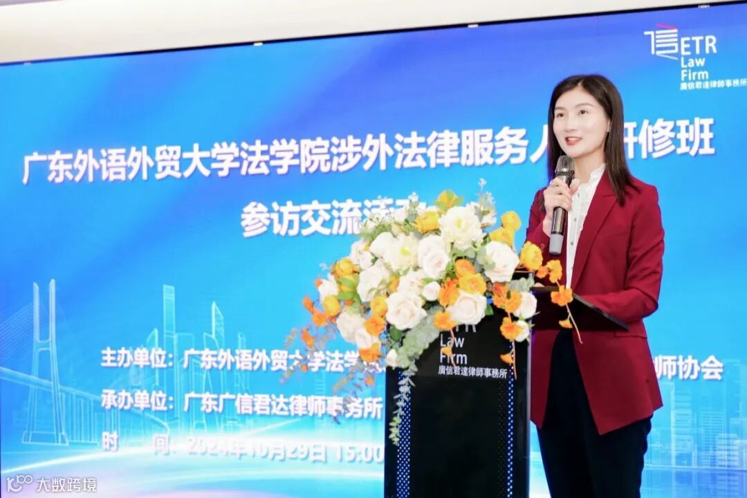 研修班学员代表陆希律师对广信君达的接待与支持表示感谢,并介绍了研修班情况及参访交流目的。她表示,广东牢牢把握历史机遇,外贸规模不断攀升,涉外经济发展持续提升,涉外法律服务特点显著,涉外律师业务水平贴近国际化要求。研修班学员期待通过本次参访交流,深入了解广东律所,学习借鉴律所管理模式、涉外业务拓展、法律人才培养等方面经验,进一步促进交流合作,互通有无,为涉外法治队伍建设注入新鲜血液。