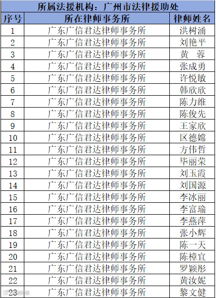 广州市法律援助处加强全市法律援助人员队伍建设,健全队伍动态化管理机制,切实提升法律援助服务质效,开展了常备法律援助人员名册的更新工作,并于近日公布了新一版《广州市常备法律援助人员名单》。