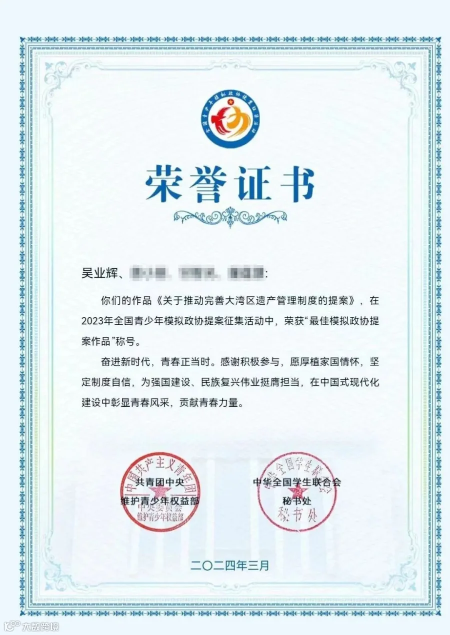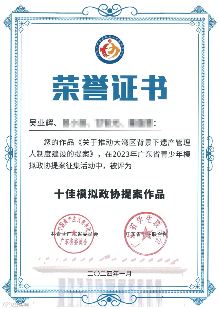 合伙人吴业辉律师在“广东省青少年模拟政协提案征集活动”中的提案荣获团中央、团广东省委表彰,展现了广信君达青年律师参政议政的热情。