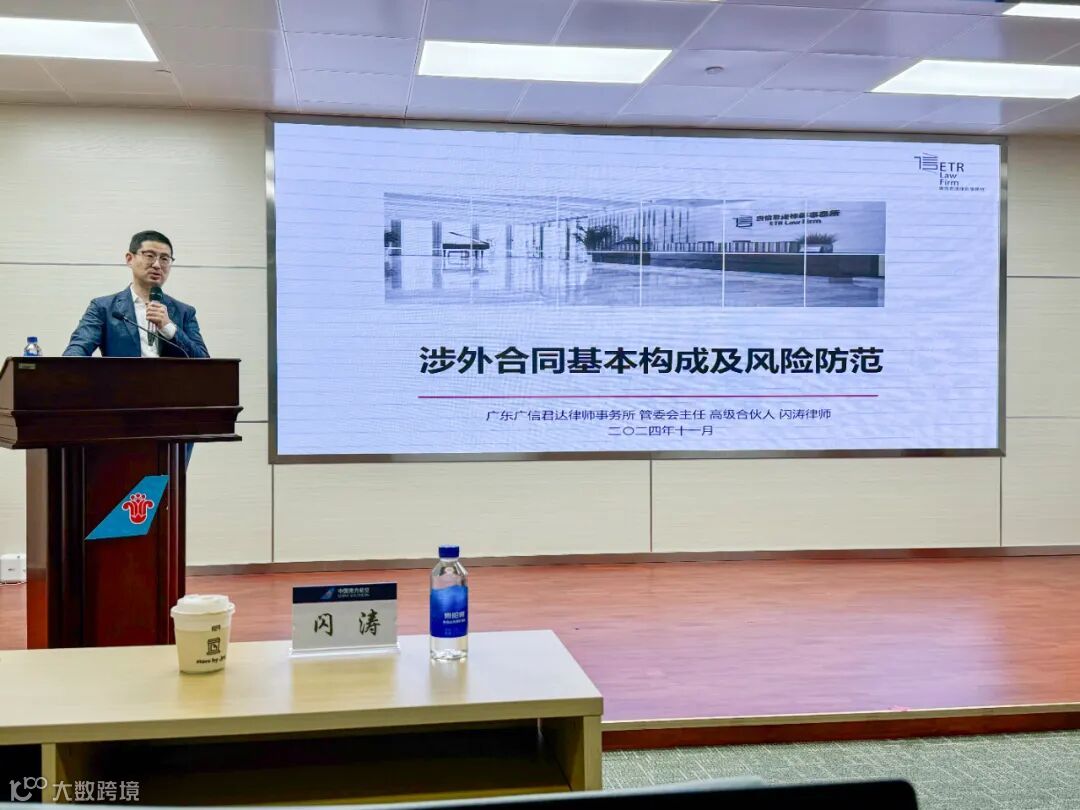 近日,广信君达律师事务所高级合伙人闪涛律师受中国南方航空股份有限公司(简称“南航”)邀请,作“涉外合同基本构成及风险防范”专题培训。本次培训共有18个会场,以线上线下相结合的方式进行,南航法律标准部/涉外事务室及有关业务部门人员参加。