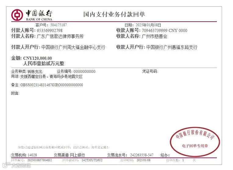 一方有难,八方支援。广信君达总分所合伙人、律师、员工踊跃捐款,短短半天内筹集善款12万元,所党委及事务所,及时将上述善款转付至广州市慈善会,用于帮助西藏、青海地震灾区受灾家庭及灾区震后恢复重建工作,为灾区群众安然过冬尽一点绵薄之力。
