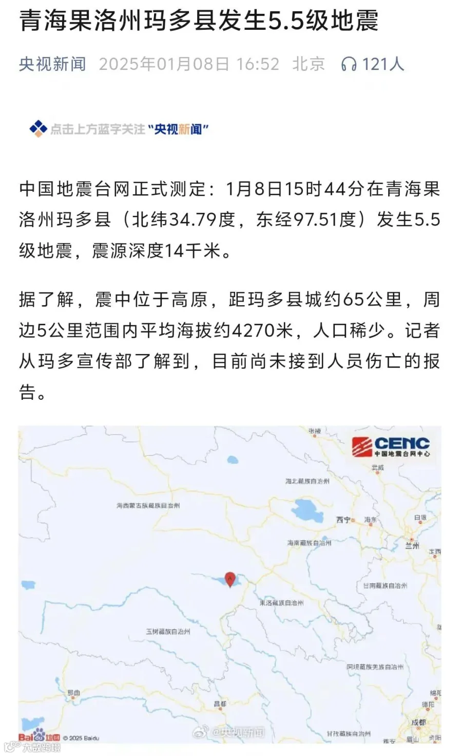 1月8日15时44分,青海果洛州玛多县发生5.5级地震。