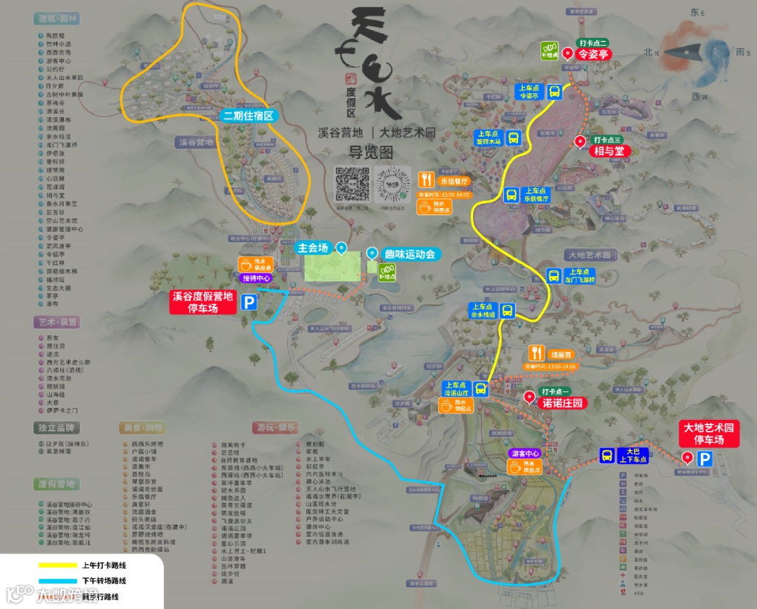 结束游玩和用餐后,14:00到游客中心换乘大巴至二期主会场,开启趣味运动会,拍摄创意合照,沉浸式露营和观赏音乐会。