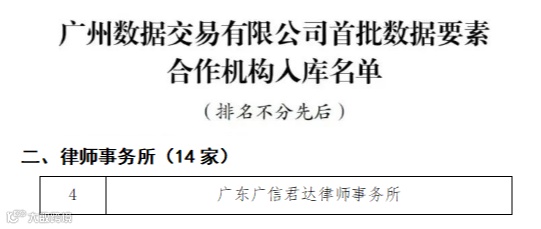 本次入库,是广州数据交易有限公司对本所律师团队专业水平和服务能力的认可和肯定。广信君达作为广州数据交易有限公司首批数据要素合作机构,将从合同、知识产权、数据隐私和安全等领域为企业提供法律保障,协助企业起草和审查数据服务合同,明确数据提供的范围、质量标准、服务费用、保密条款等内容;确保企业数据产品不侵犯他人知识产权的同时维护自身知识产权合法权益;加强企业在数据收集、存储、传输和使用各个环节对数据安全的保障措施等。