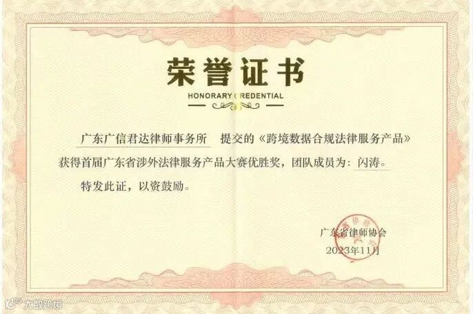 2023年,广信君达成立了数字经济法律专业部,被律新社评为数据合规领域“品牌影响力律所”,闪涛律师被评为数据合规领域“品牌之星(实力律师)”,4位律师通过了国际信息科学考试学会(EXIN)数据保护官(DPO)认证,团队研发的《欧盟 GDPR 数据合规法律服务产品》获评2022广州律师法律服务产品大赛特别优秀产品,《跨境数据合规法律服务产品》获得首届广东省涉外法律服务产品大赛优胜奖,参与多家企业数据资产入表项目。