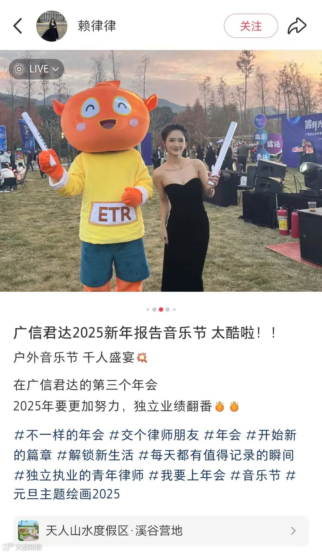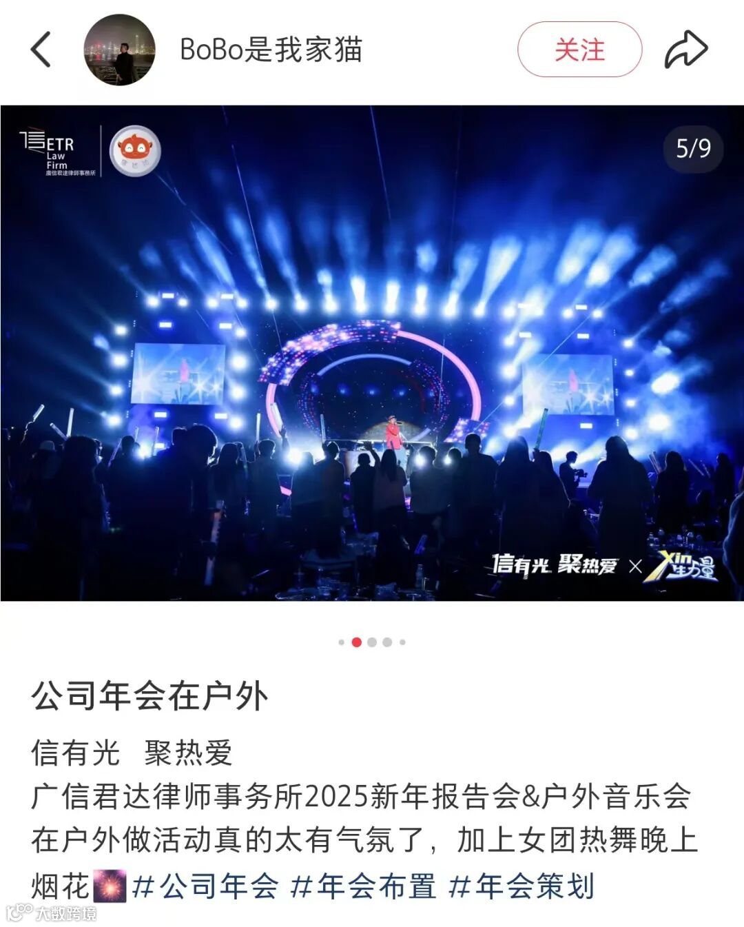 年会的惊喜与仪式感由此开启,草地、露营、烟火、说唱、乐队、舞蹈······每一个瞬间都充满了欢笑与感动,每一帧画面都定格着美好与温馨。每一位广信君达的小伙伴,不仅是这场年会的参与者,更是最忠实的记录者,用镜头捕捉着精彩瞬间,用科技珍藏着年会细节。