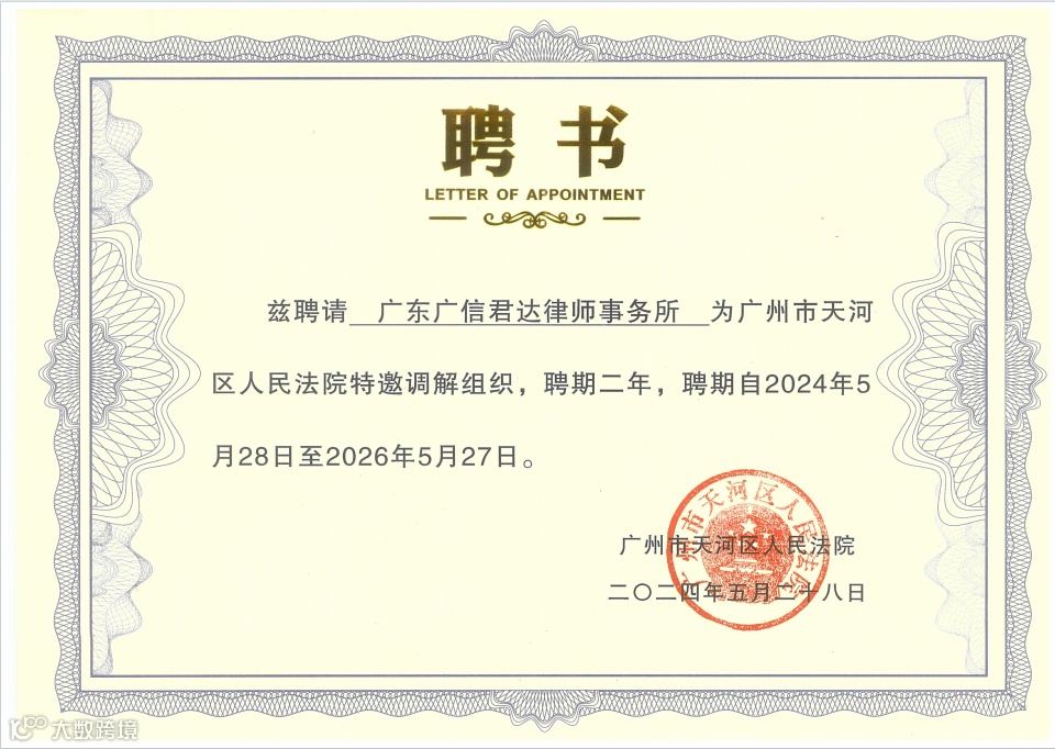 简讯 | 广信君达及三名律师获聘为天河法院特邀调解组织、特邀调解员