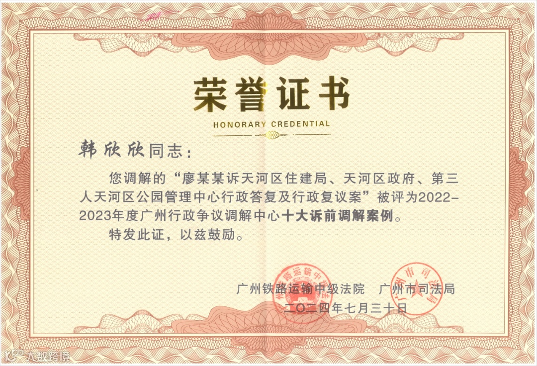 本所获聘为天河法院特邀调解组织,黄丽芬、徐颖佳、李媛媛三名律师获聘为特邀调解员;廖艺行律师获聘为广州穗基协私募投资行业人民调解委员会副主任;罗颖彤律师获聘为广州行政争议调解中心白云工作站兼职调解员;合伙人张由律师受聘为黄埔区法学会首席法律咨询专家;合伙人付丽莎律师及兼职律师阳庚德获聘为第七届佛山仲裁委员会仲裁员;合伙人韩欣欣律师、谭俊谦律师续聘为广州行政争议调解中心特邀调解员,韩欣欣律师经办的“廖某某诉天河区住建局、天河区政府、第三人天河区公园管理中心行政答复及行政复议案”调解案件获评为2022-2023年度广州行政争议调解中心十大诉前调解案例。
