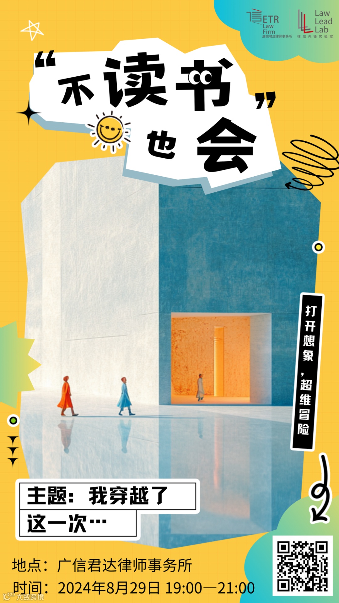 广信君达律师事务所定期举办传统读书会,受到广大律师同事的欢迎。本次,我们将继续打破常规,赴一场“穿越”般的“不读书也会”,共探讨有深度且有趣味的问题,为生活添加一点“天马行空”的浪漫!欢迎各位青年朋友积极扫码报名,我们在活动现场等你📚~