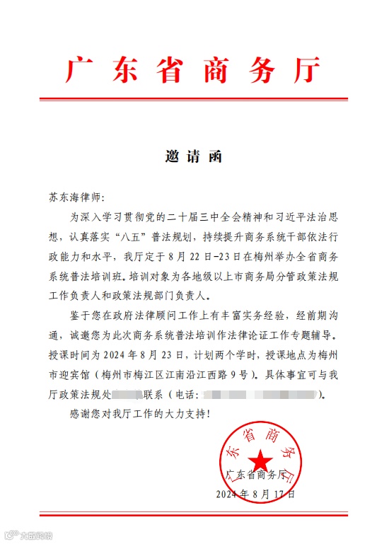 其中,广信君达律师事务所高级合伙人苏东海律师担任广东省人民政府法律顾问,应邀作法律论证工作专题辅导,讲授《合法性审查的“六要六不要”——谈合法性审查工作的主要事项》。