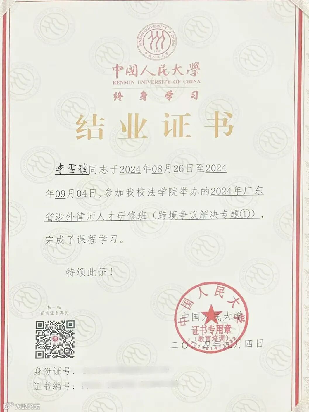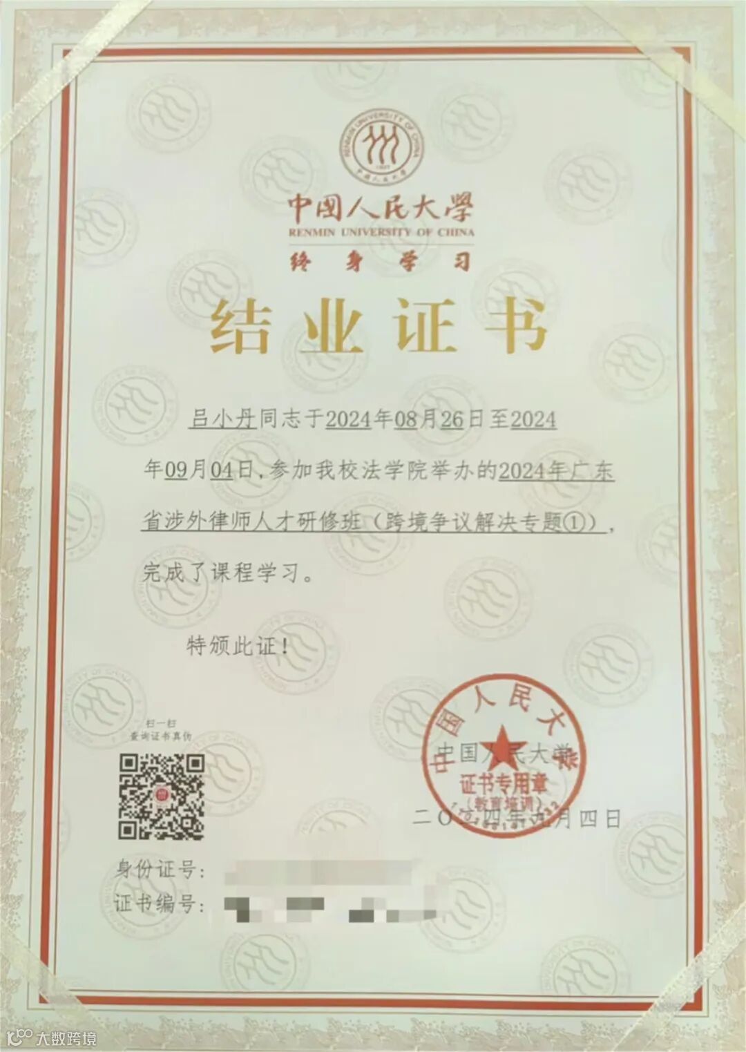 为培养广东省律师跨境争议解决领域的实务能力,更好地服务广东省企业“走出去”,2024年8月25日至9月4日,由广东省司法厅、广东省律师协会主办,中国人民大学承办的总第二十二期广东省涉外律师人才研修班(跨境争议解决专题①)在中国人民大学法学院举办。广东省律师协会副会长彭华,中国人民大学法学院党委书记兼副院长、教授杜焕芳出席开班仪式并致辞。来自全省共110名律师参加培训,其中,广信君达律师事务所吕小丹律师、东莞分所袁洁律师、珠海分所康威律师、南沙分所李雪薇律师参加并顺利结业。