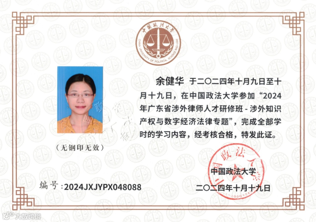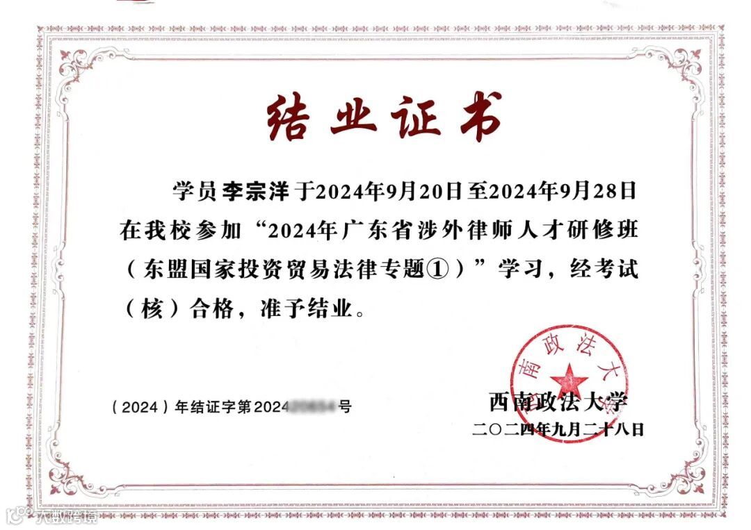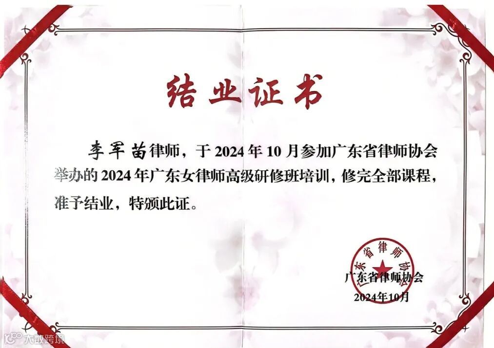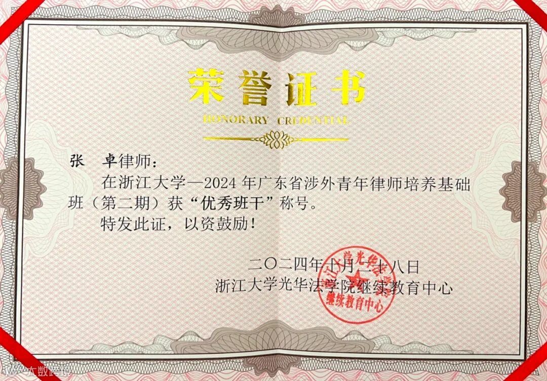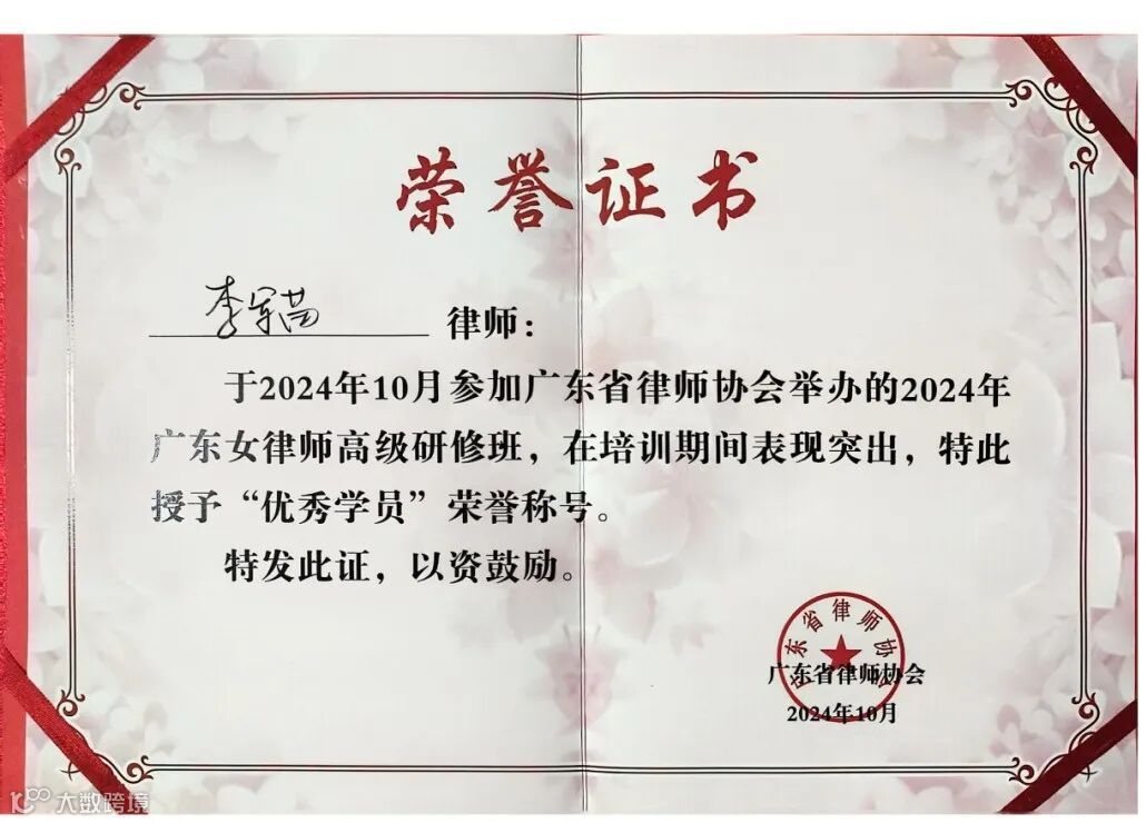 本所朱琳琳律师、东莞分所李宗洋律师参加广东省涉外律师人才研修班(东盟国家投资贸易法律专题①)并获评“优秀班干部”,合伙人梁晓惠律师、清远分所李军苗律师参加2024年广东女律师高级研修班并获评“优秀学员”,余健华律师参加广东涉外律师人才研修班(涉外知识产权与数字经济法律专题),张卓律师参加2024年广东涉外律师人才研修班——涉外青年律师培养基础班第二期并获评“优秀班干”。