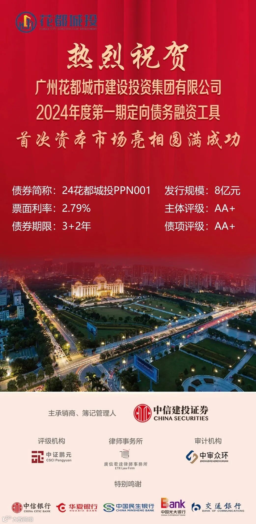 2024年11月,广州花都城市建设投资集团有限公司(下称“花都城投”)2024年度第一期定向债务融资工具(下称“项目”)成功发行,主体评级AA+,债券期限3+2年,债项评级AA+,发行规模8亿元,票面利率2.79%,项目资本市场首次圆满亮相。