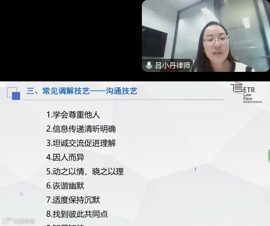 广信君达律师事务所吕小丹、吴婷婷、韩毅三位律师,受邀担任主讲嘉宾,开展线上培训授课。三位律师围绕劳动争议调解程序与方法,分析了典型劳动争议案例,对常见争议问题进行了解读,并重点讲解了劳动保障法律法规及构建和谐劳动关系的政策导向。通过生动的案例分析、深入浅出的讲解,学员们对劳动争议调解工作有了更全面、深刻的理解。