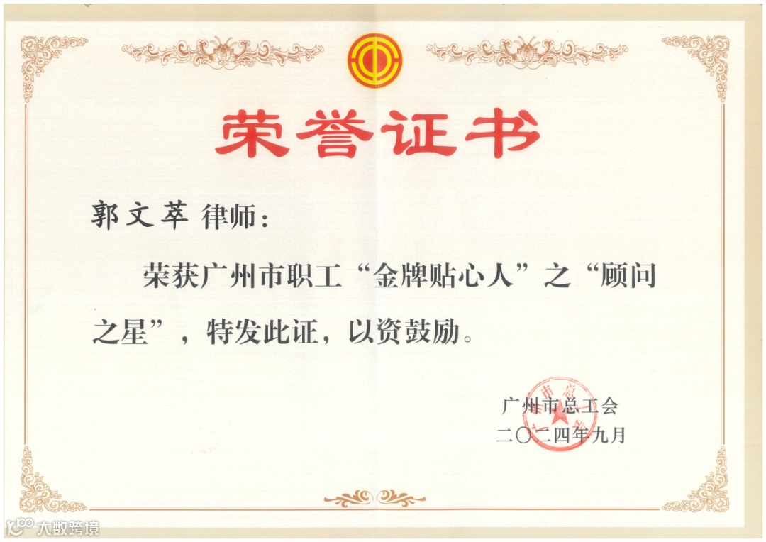 广信君达律师收获的荣誉不仅是一份荣耀,更是一份沉甸甸的责任。律师们以专业素养为矛,以法治精神为盾,在调解室里用智慧和耐心化解矛盾,也在法庭上为弱势群体发声,为公平正义护航。这是对工会律师服务全市高质量发展与社会和谐稳定的认可,也是对广州市总工会创新实行“12345”工作法等系列举措成效的有力证明。