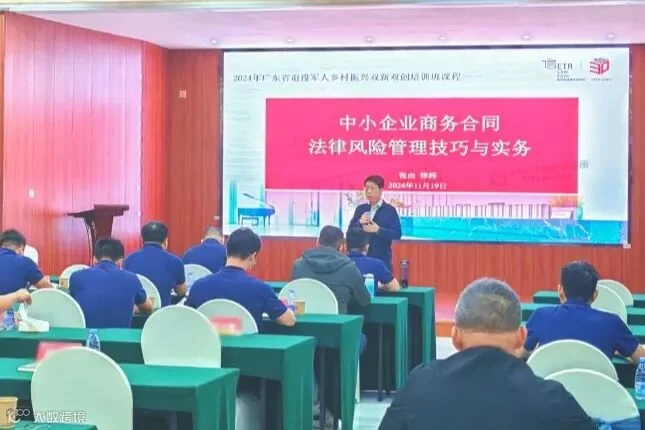 为深入贯彻国家关于退役军人服务保障工作的战略部署,进一步提升退役军人对就业创业政策的知晓率和收益面,2024年11月19日,广信君达律师事务所合伙人张由律师受邀为广东省退役军人事务厅主办、广州国家现代农业产业科技创新中心承办的“2024年广东省退役军人乡村振兴双新双创培训班”,开展“中小企业商务合同法律风险管理技巧与实务”专题培训,广东省各地市50余名涉农退役军人创业代表参加。