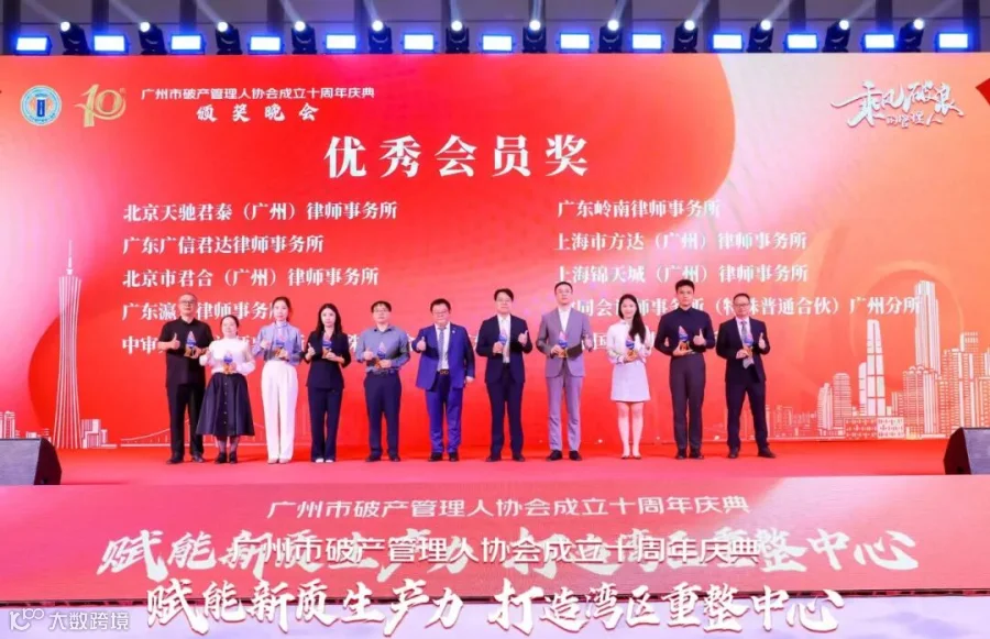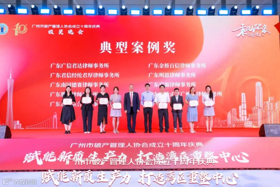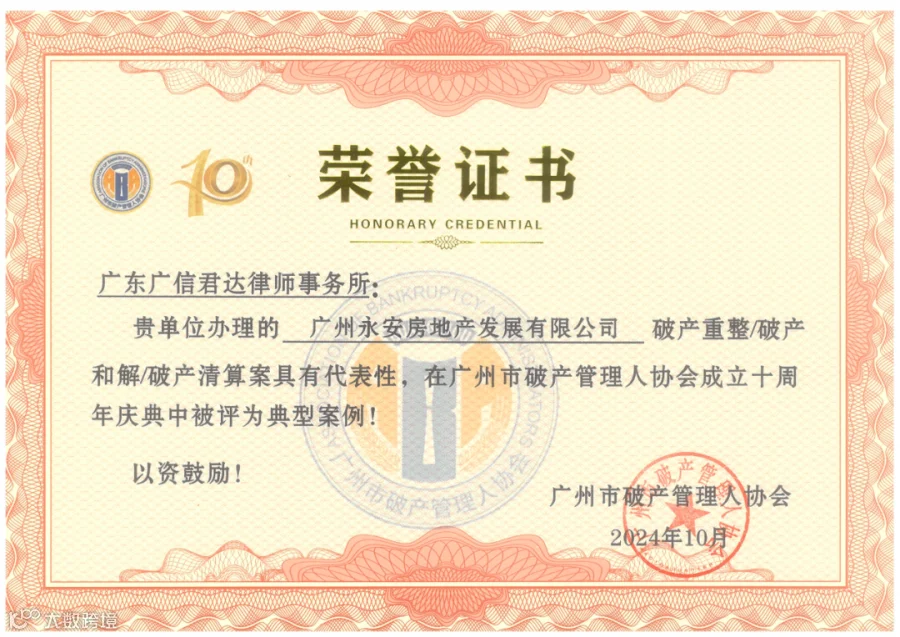 在广州市破产管理人协会成立十周年庆典活动颁奖晚会上,广信君达荣获特殊贡献奖、优秀公益管理人奖、优秀会员奖,经办的案件荣获典型案例奖;肖小俊律师荣获优秀管理人奖,其参与主编的《广州市破产管理人协会破产典型案例》书籍,共收录了60个破产典型案例,其中,本所办理的广州某房地产公司破产清算案入选经典案例。