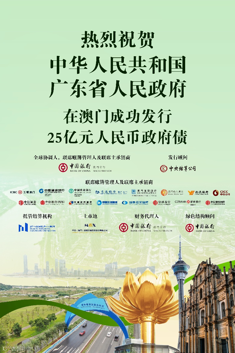 广东省人民政府此次再度在澳门发行地方政府债券,是深入贯彻落实党中央、国务院决策部署,紧密协同澳门推进粤港澳大湾区建设的重要举措,也是深化粤澳两地跨境金融合作的具体行动。同时,持续发行绿色债券,不仅有助于提升澳门金融市场的深度和广度,也有助于吸引更多资金“活水”助力“双碳”目标实现,推动粤港澳大湾区绿色金融协同发展。首次在澳门发行以横琴粤澳深度合作区为主题的专项债券,用于横琴粤澳深度合作区重大基础设施建设,将推动澳门金融机构更好地参与深合区建设,为澳门更好融入国家发展大局注入新动力。