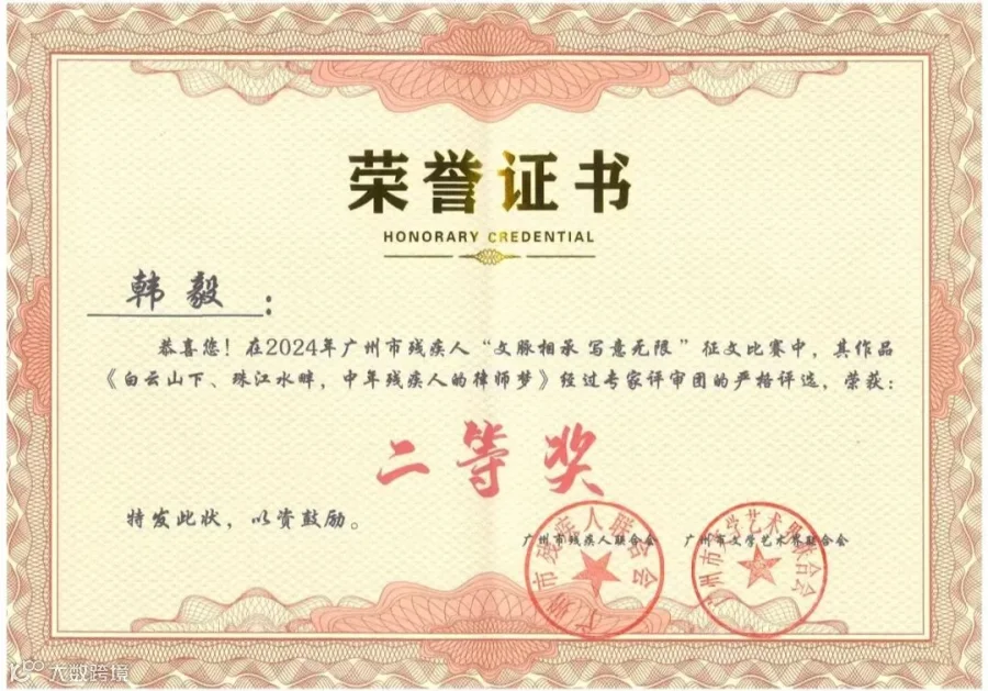 经过严格而公正的评审,本次活动评选出一、二、三等奖、优秀奖、最具潜力奖及优秀组织单位等奖项。其中,广信君达律师事务所韩毅律师的作品《白云山下、珠江水畔,中年残疾人的律师梦》荣获征文活动散文类二等奖。