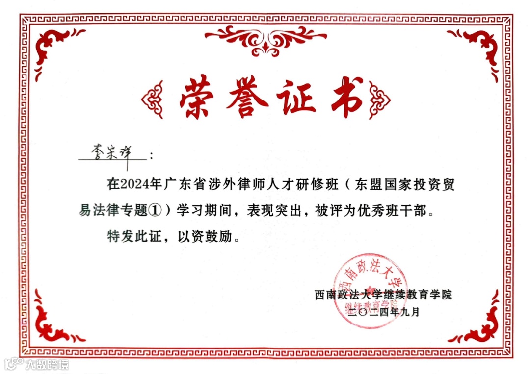为加强广东省关于东盟法律人才培养和储备,提升广东省律师涉外法律服务能力,2024年9月20日至9月28日,由广东省司法厅、广东省律师协会主办,西南政法大学承办的总第二十三期广东省涉外律师人才研修班(东盟国家投资贸易法律专题①)在重庆开班。广东省律师协会副会长陈国翔,西南政法大学国际法学院党委书记吕亮出席开班仪式并致辞。来自广东省各市共120名律师参加培训,其中,广信君达律师事务所朱琳琳律师、东莞分所李宗洋律师参加并顺利结业。