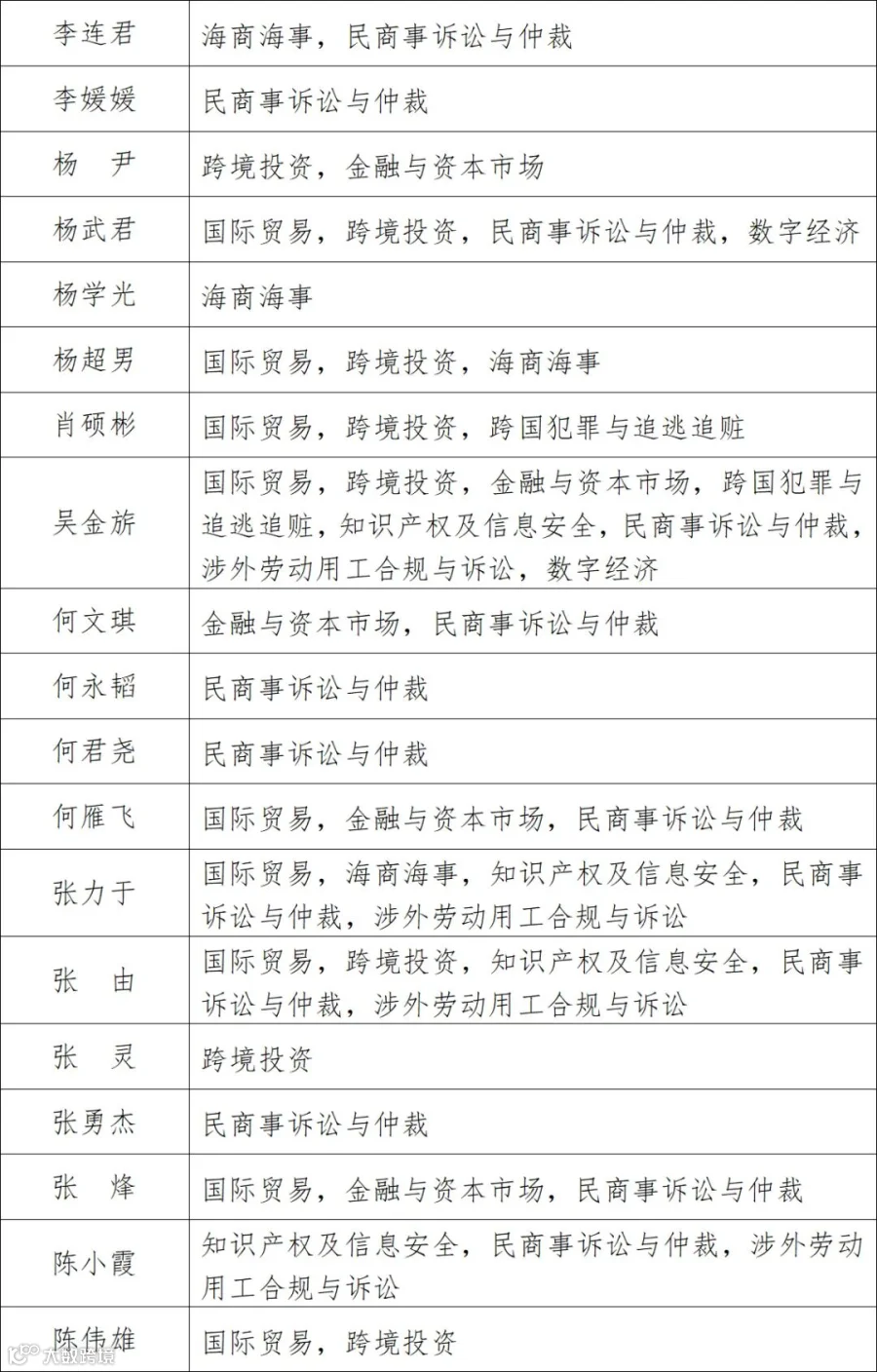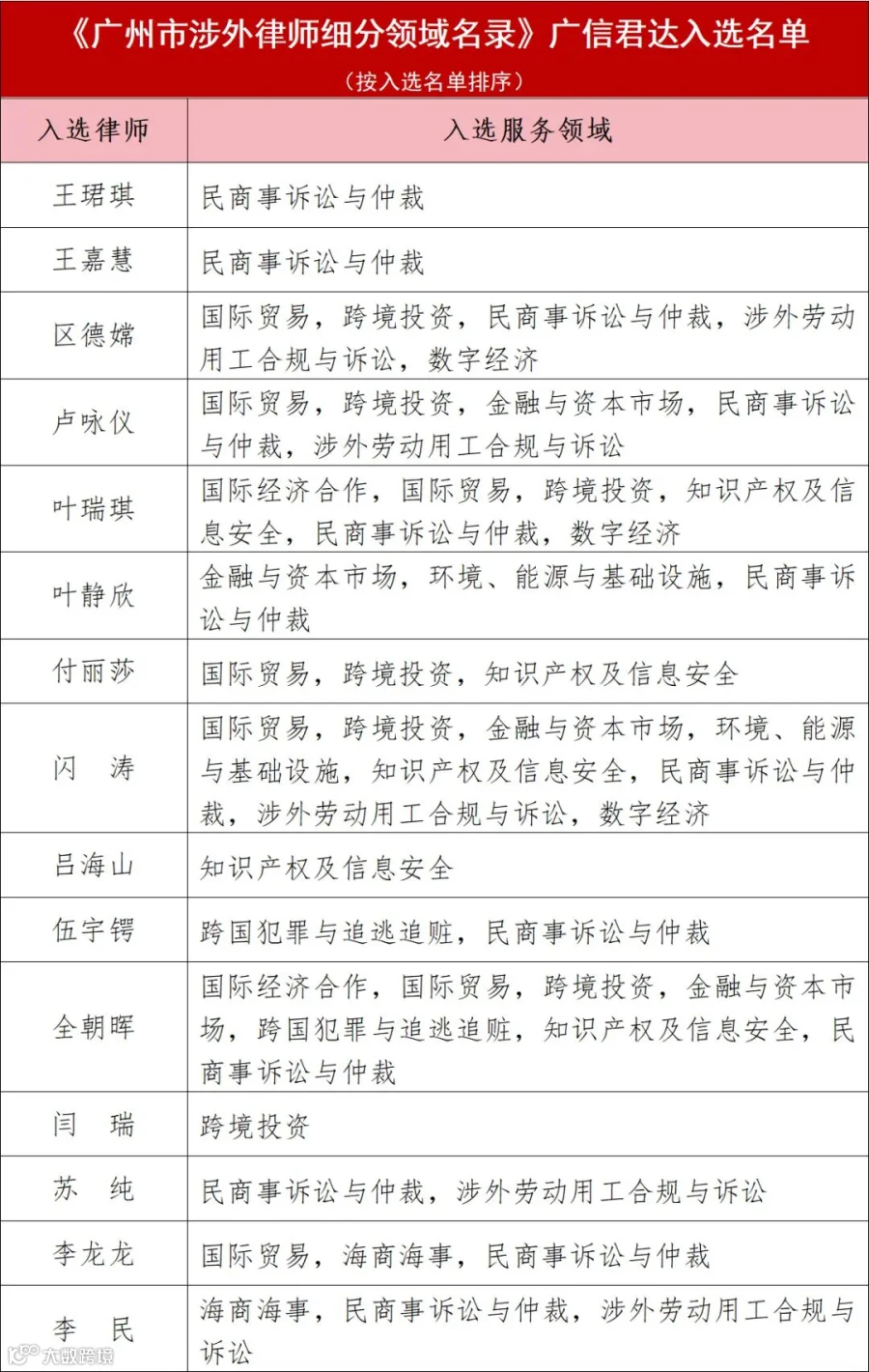 广信君达入选律师从业领域涵盖了国际经济合作、国际贸易、跨境投资、环境能源与基础设施、海商海事、跨国犯罪与追逃追赃、知识产权及信息安全、民商事诉讼与仲裁、涉外劳动用工合规与诉讼、数字经济等专业领域及其下等40余项细分领域;业务范围覆盖港澳、东亚、南亚、西亚、北美、欧洲多个国家和地区。