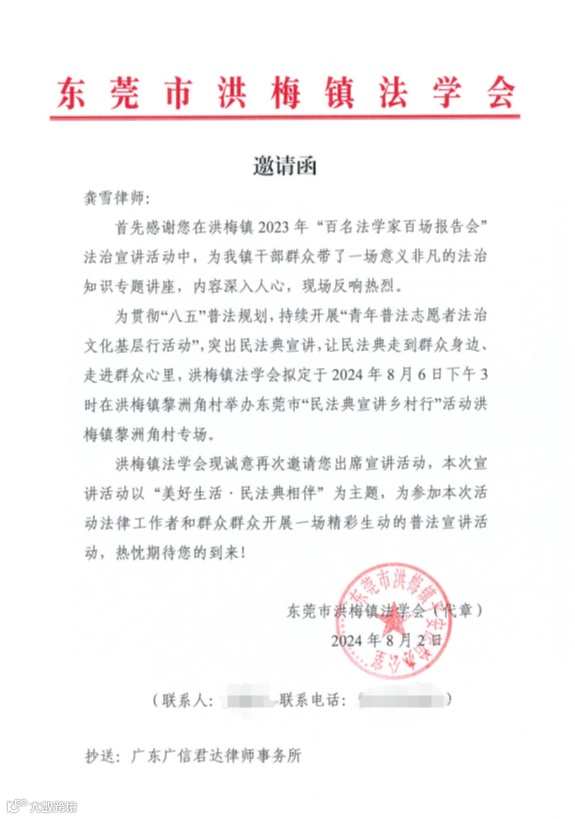 近日,广信君达律师事务所合伙人龚雪律师,先后应东莞市洪梅镇法学会、深圳市罗湖区法学会的邀请,赴东莞市洪梅镇黎洲角村、深圳市罗湖区桂圆街道参与“民法典宣讲乡村行”活动,开展两场“美好生活·民法典相伴”主题普法讲座。