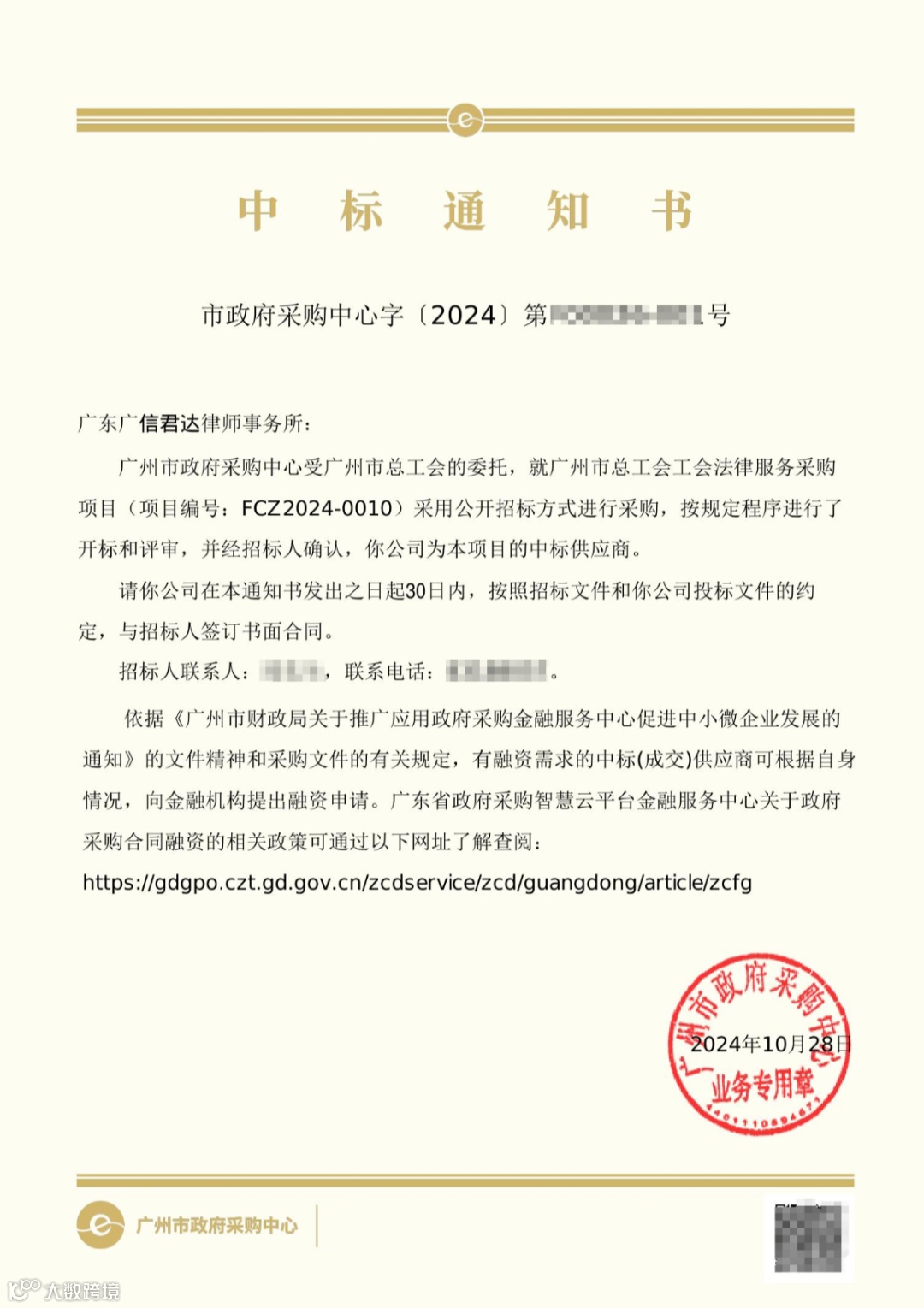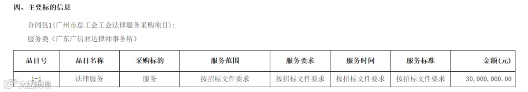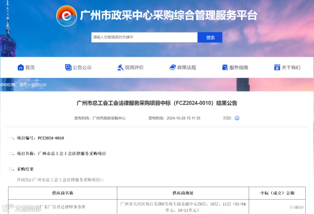 近日,广州市政府采购中心揭晓了《广州市总工会工会法律服务采购项目中标(FCZ2024-0010)结果公告》,经过公开招标采购、规范开标以及严格评审等程序,广信君达律师事务所以总得分99.77分,排名第一中标该法律服务项目。