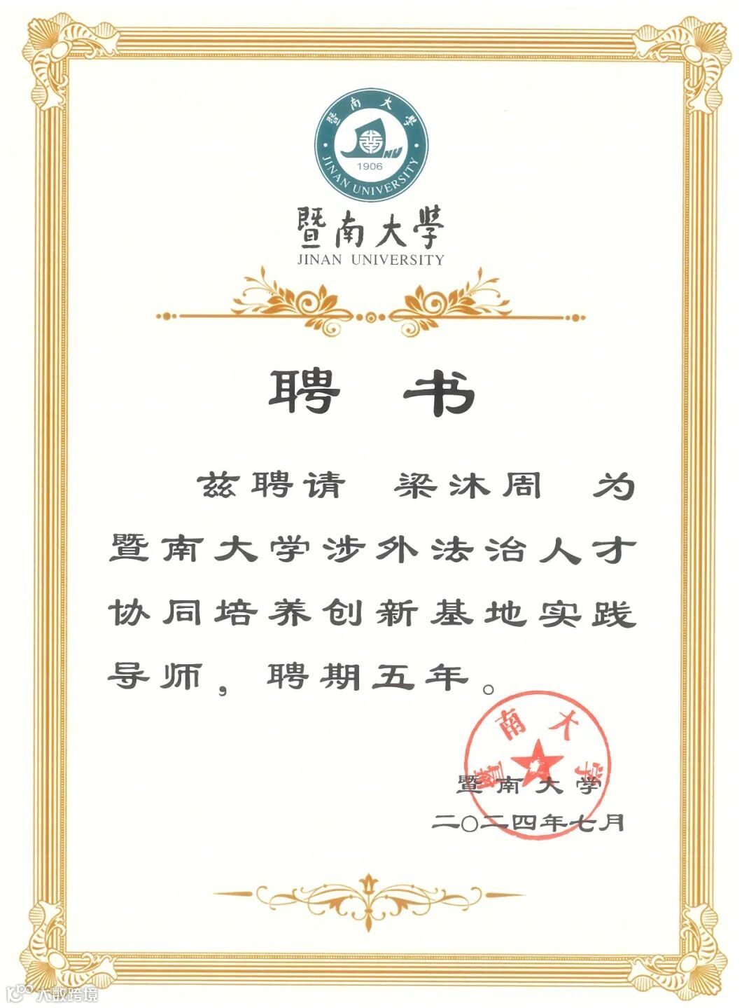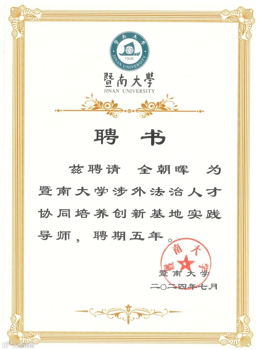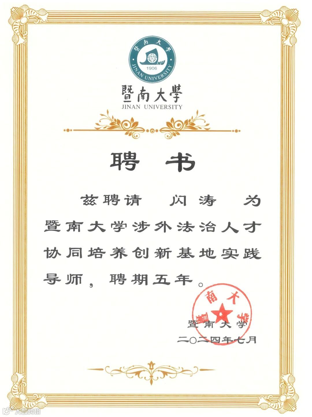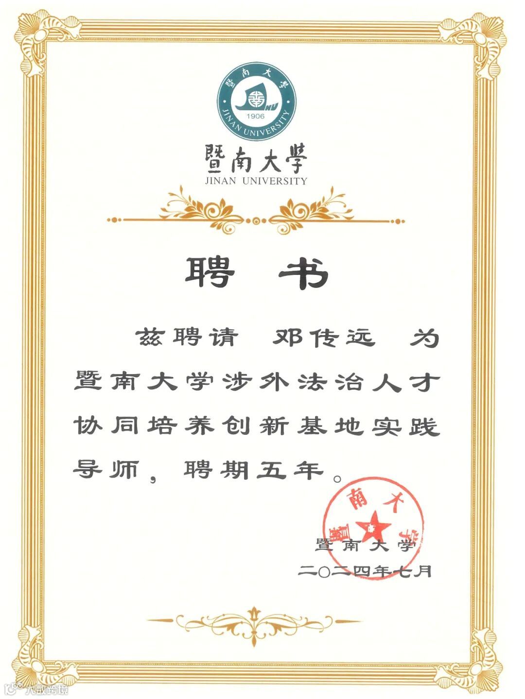 会议举行了暨南大学兼职教授与实践导师聘任仪式,本所邓传远、苏东海、全朝晖、闪涛、梁沐周律师受聘为暨南大学涉外法治人才协同培养创新基地实践导师。