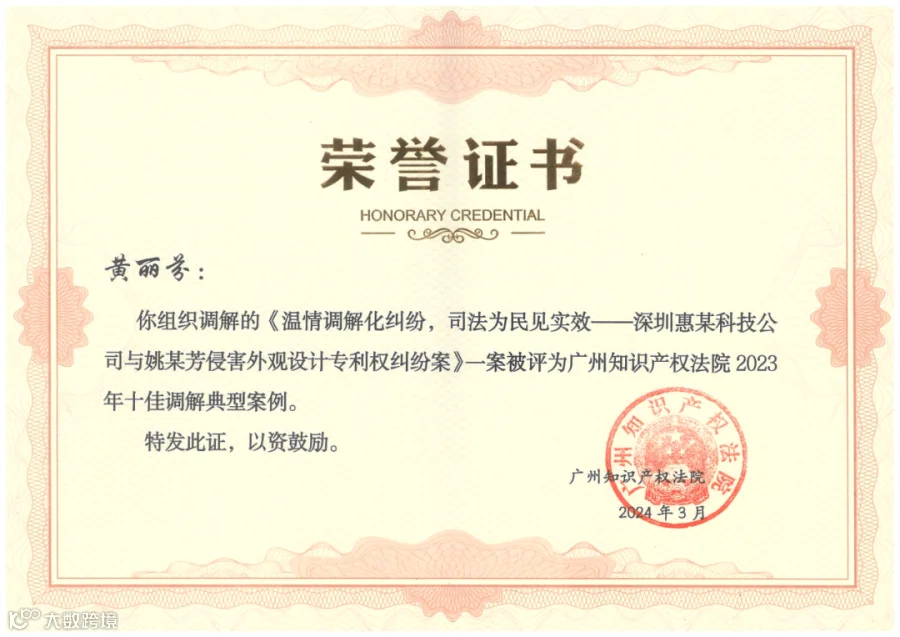 近日,广州知识产权法院召开2023年诉前调解工作座谈会,总结成绩,分享经验,研讨下步工作部署。会上,广州知识产权法院公布“2023年十佳调解典型案例”,表彰通报2023年优秀特邀调解组织和优秀调解员,广信君达律师事务所黄丽芬律师组织调解的“深圳惠某科技公司与姚某芳侵害外观设计专利纠纷案”入选广州知识产权法院“2023年十佳调解典型案例”。