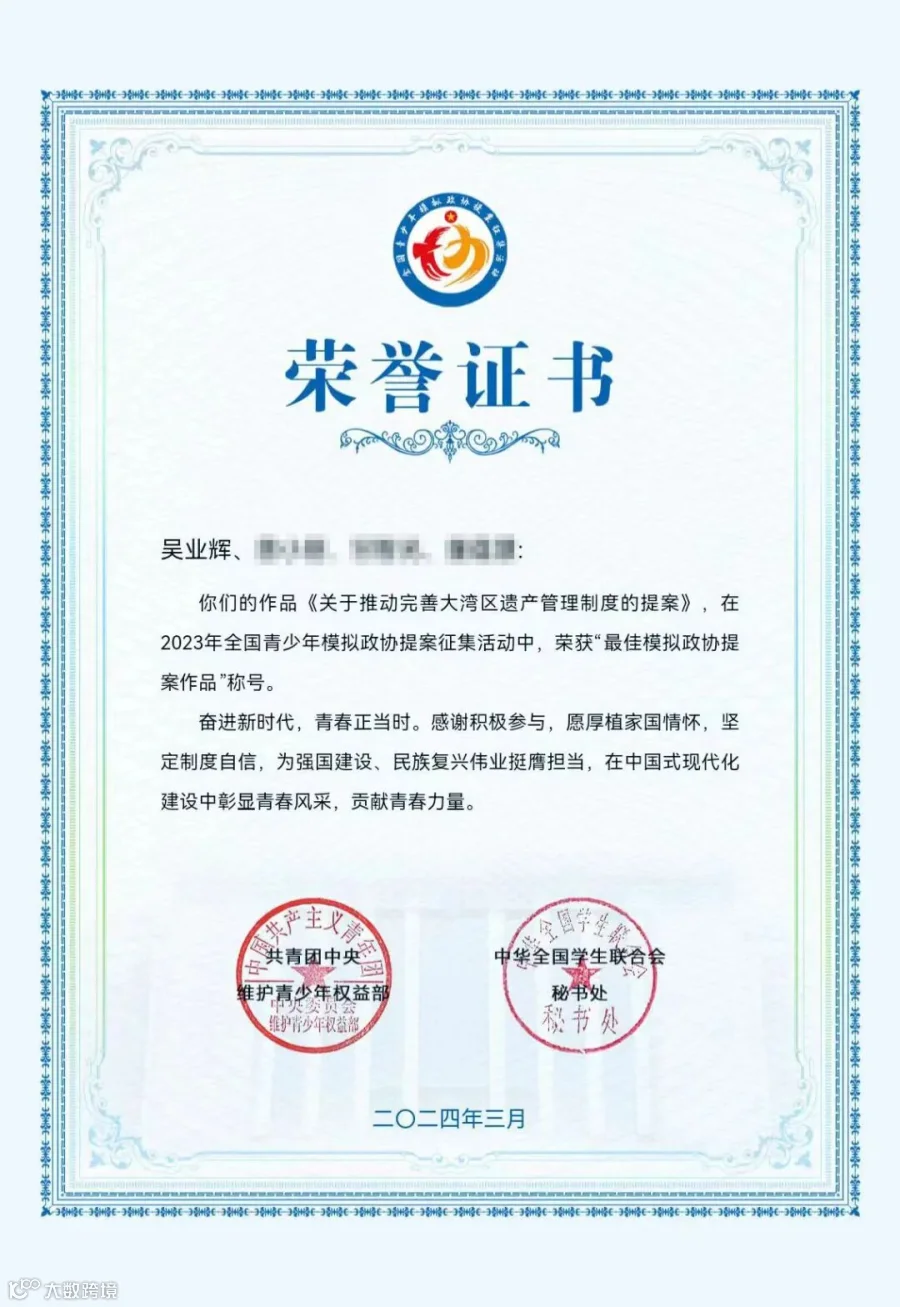 上述作品经共青团广东省委指导优化,形成《关于推动完善大湾区遗产管理制度的提案》,代表广东省推荐至团中央。最终,该提案获团中央、中华全国学生联合会评为2023年全国青少年模拟政协提案征集活动“最佳模拟政协作品”。