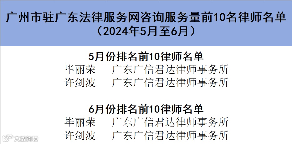 本所毕丽荣、许剑波律师2024年5月至6月的驻网咨询服务量排名前10,获广州市司法局、广州律协通报表扬。