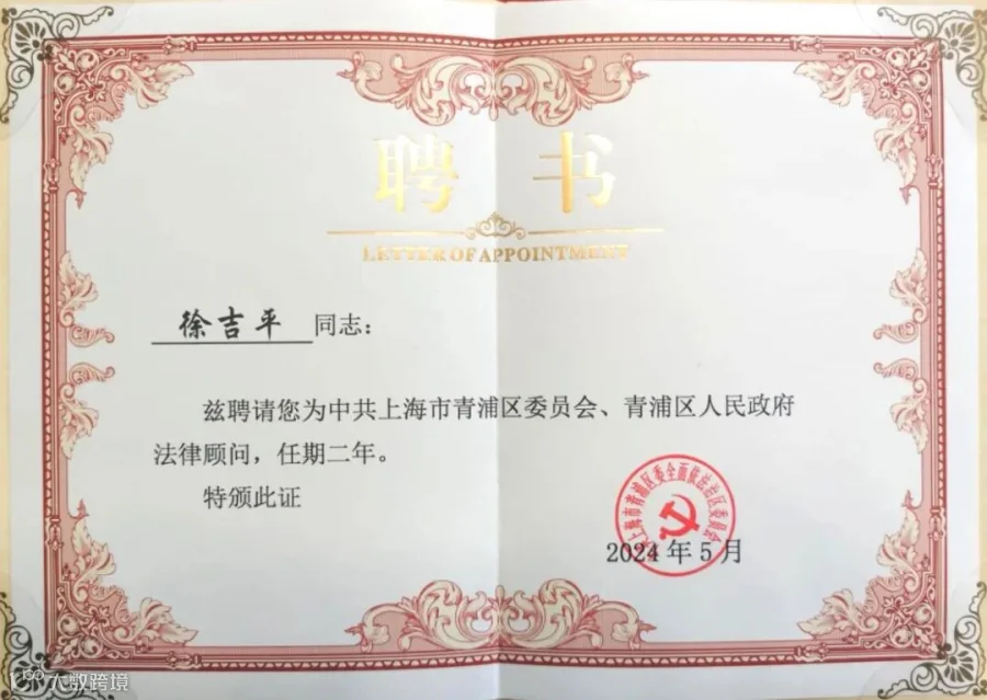 近日,广信君达(上海)律师事务所(简称“广信君达上海分所”)执行主任徐吉平律师再次获聘为中共上海市青浦区委员会、青浦区人民政府法律顾问,为区委、区政府作出重大决策、出台重要文件、处置重大事件、开展法治建设课题研究等政府与公共法律事务提供专业法律意见。