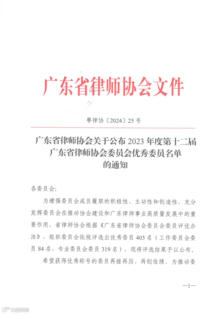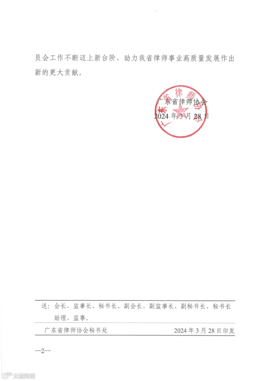 本次获评优秀委员,体现了广东省律师协会对广信君达及律师专业能力的认可。今后,广信君达及律师将秉持“效率、信任、责任”的核心理念,立足律师岗位,认真履行委员职责,发挥积极性、主动性、创造性,继续支持广东省律师协会的工作,为推动委员会工作不断迈上新台阶、助力广东省律师事业高质量发展作出新的更大贡献。